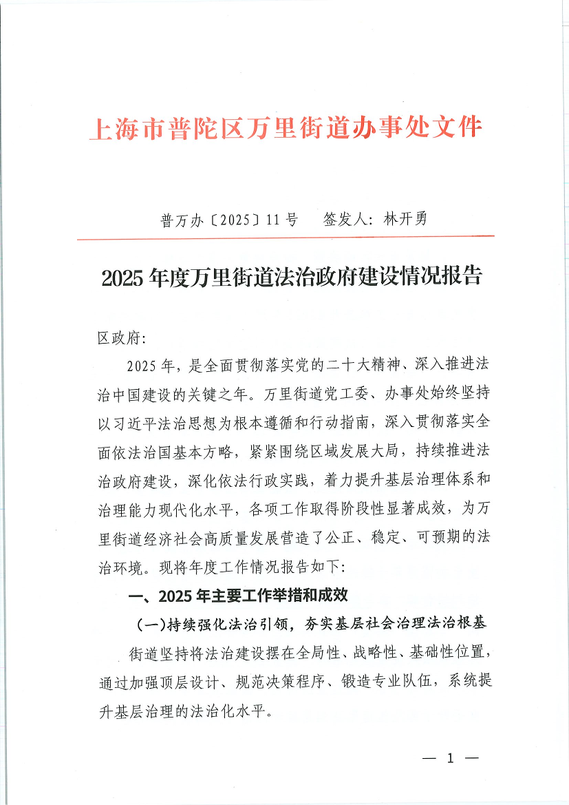 2025年,是全面贯彻落实党的二十大精神、深入推进法治中国建设的关键之年。万里街道党工委、办事处始终坚持以习近平法治思想为根本遵循和行动指南,深入贯彻落实全面依法治国基本方略,紧紧围绕区域发展大局,持续推进法治政府建设,深化依法行政实践,着力提升基层治理体系和治理能力现代化水平,各项工作取得阶段性显著成效,为万里街道经济社会高质量发展营造了公正、稳定、可预期的法治环境。现将年度工作情况报告如下: