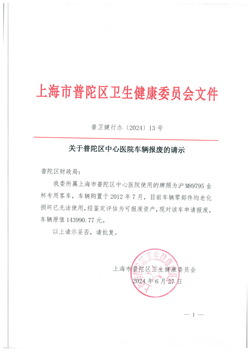 我委所属上海市普陀区中心医院使用的牌照为沪M89795金杯专用客车,车辆购置于2012年7月,目前车辆零部件均老化损坏已无法使用,经鉴定评估为可报废资产,现对该车申请报废,车辆原值143990.77元。