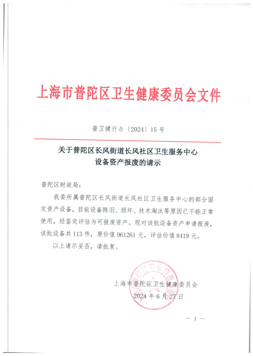 关于普陀区长风街道长风社区卫生服务中心设备资产报废的请示