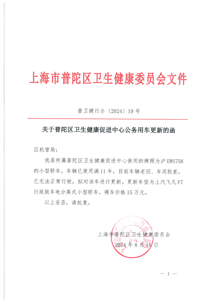 我委所属普陀区卫生健康促进中心使用的牌照为沪EWS758的小型轿车,车辆已使用满11年,目前车辆老旧、车况较差,已无法正常行驶,拟对该车进行更新。更新车型为上汽飞凡F7行政版车电分离式小型轿车,裸车价格15万元。