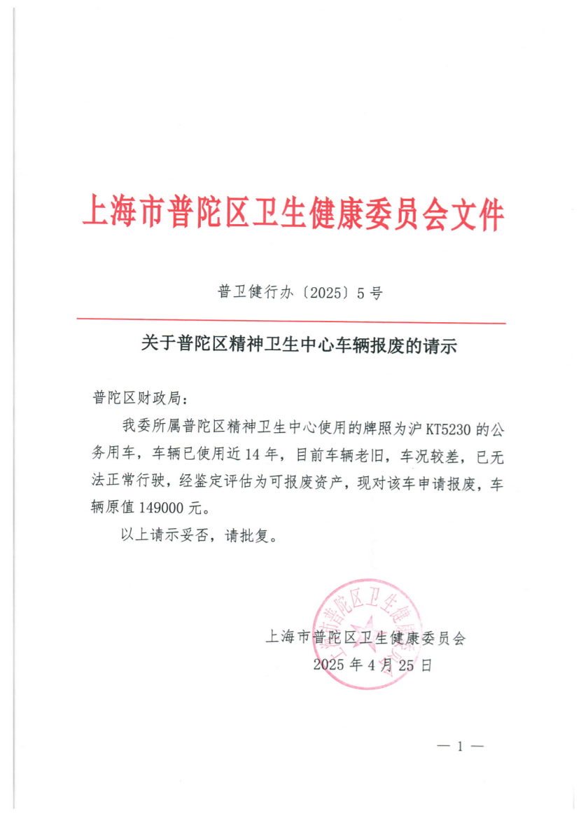 我委所属普陀区精神卫生中心使用的牌照为沪KT5230的公务用车,车辆已使用近14年,目前车辆老旧,车况较差,已无法正常行驶,经鉴定评估为可报废资产,现对该车申请报废,车辆原值149000元。