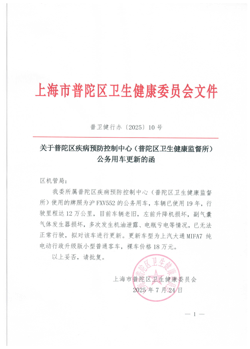 我委所属普陀区疾病预防控制中心(普陀区卫生健康监督所)使用的牌照为沪FXV552的公务用车,车辆已使用19年,行驶里程达12万公里,目前车辆老旧,左前升降机损坏,副气囊气体发生器损坏,多次发生机油泄露、电瓶亏电等情况,已无法正常行驶,拟对该车进行更新。更新车型为上汽大通MIFA7 纯电动行政升级版小型普通客车,裸车价格18万元。