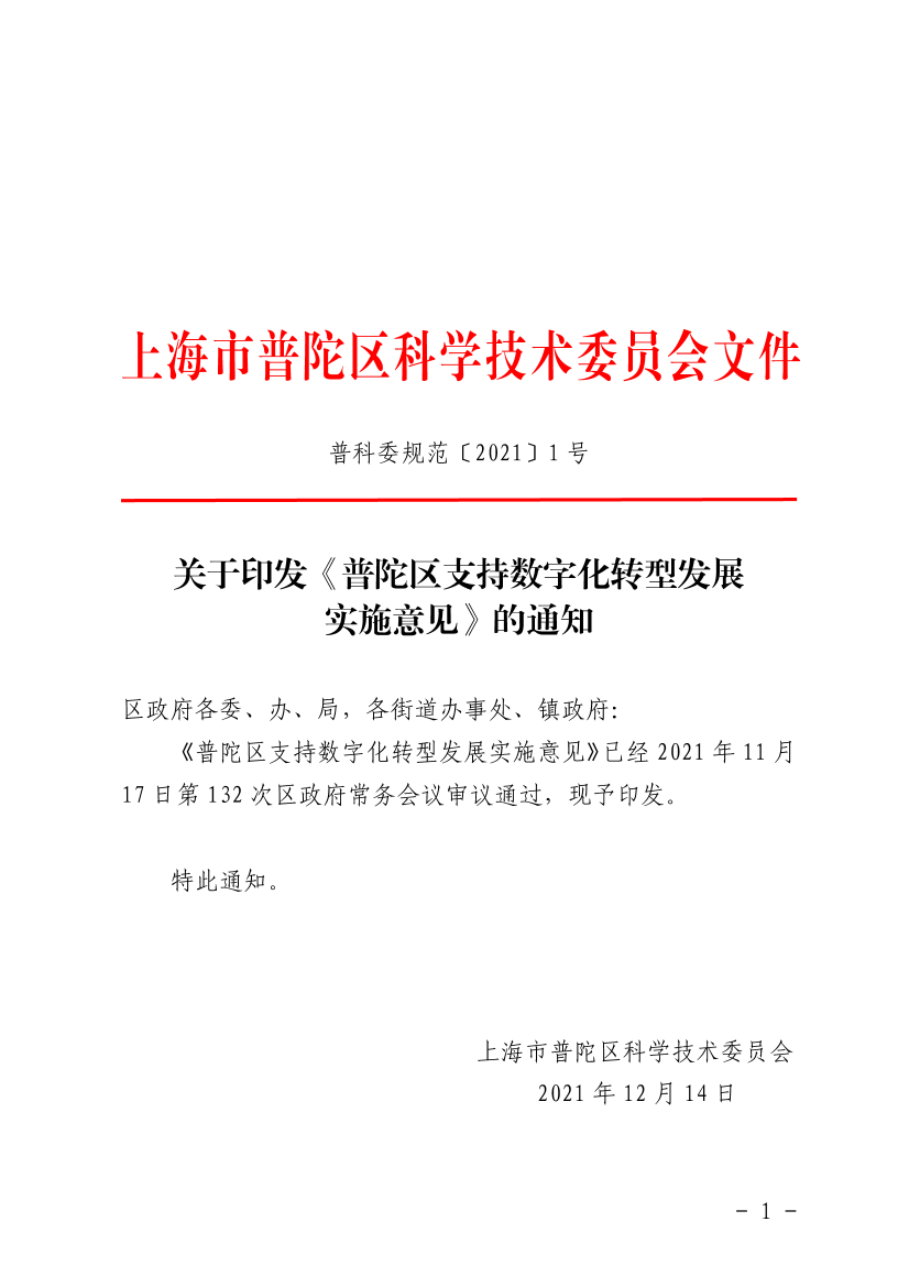 关于印发《普陀区支持数字化转型发展实施意见》的通知