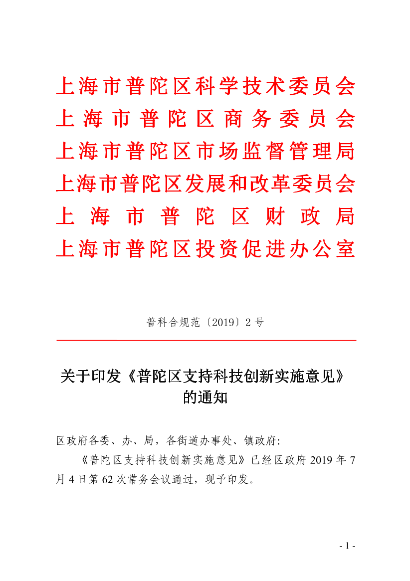《普陀区支持科技创新实施意见》已经区政府2019年7月4日第62次常务会议通过,现予印发。