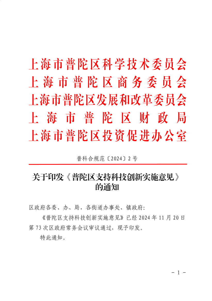 《普陀区支持科技创新实施意见》已经2024年11月20日第73次区政府常务会议审议通过,现予印发。