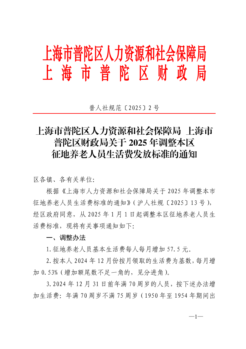 上海市普陀区人力资源和社会保障局 上海市普陀区财政局关于2025年调整本区征地养老人员生活费发放标准的通知