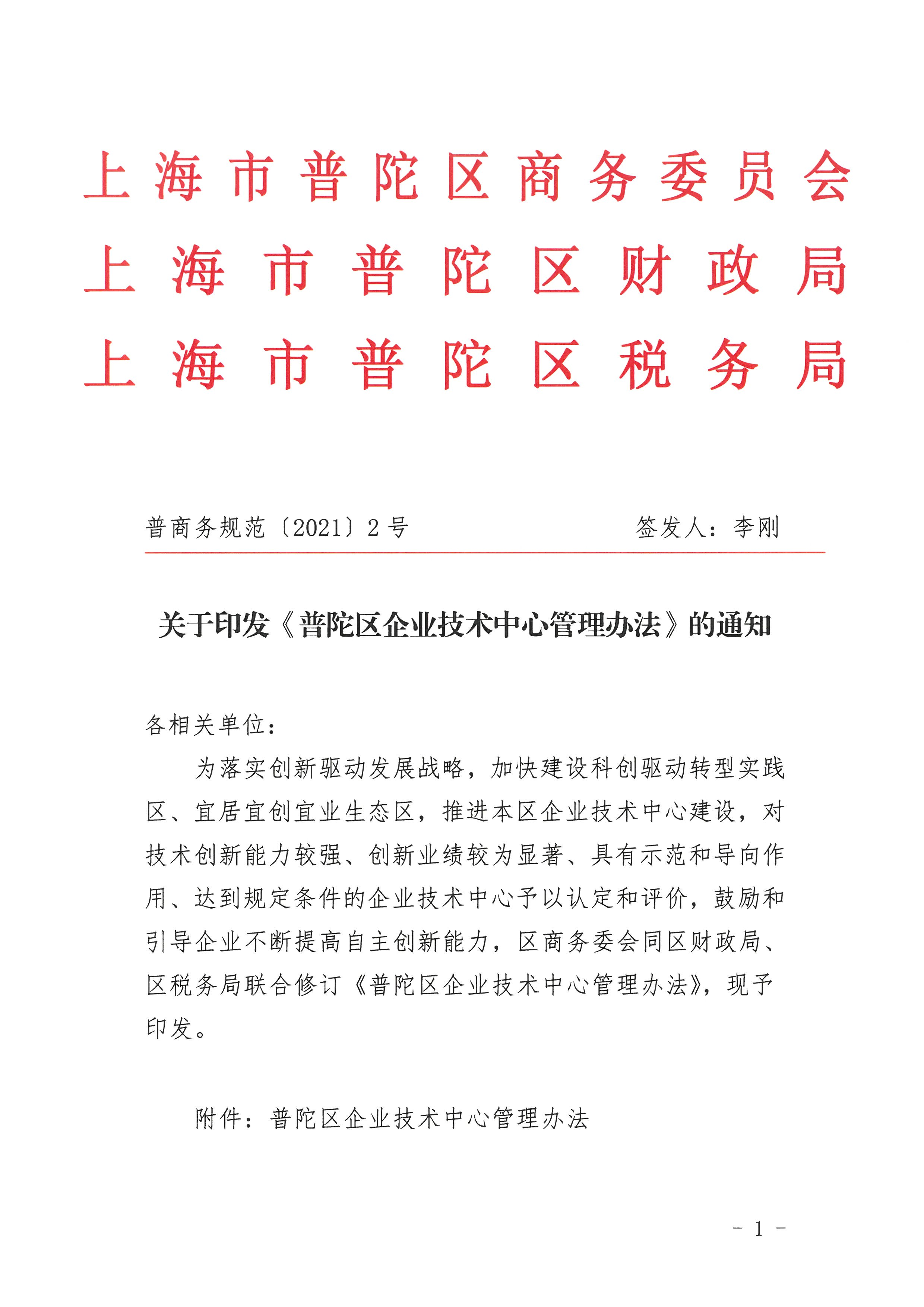 为落实创新驱动发展战略,加快建设科创驱动转型实践区、宜居宜创宜业生态区,推进本区企业技术中心建设,对技术创新能力较强、创新业绩较为显著、具有示范和导向作用、达到规定条件的企业技术中心予以认定和评价,鼓励和引导企业不断提高自主创新能力,区商务委会同区财政局、区税务局联合修订《普陀区企业技术中心管理办法》,现予印发。