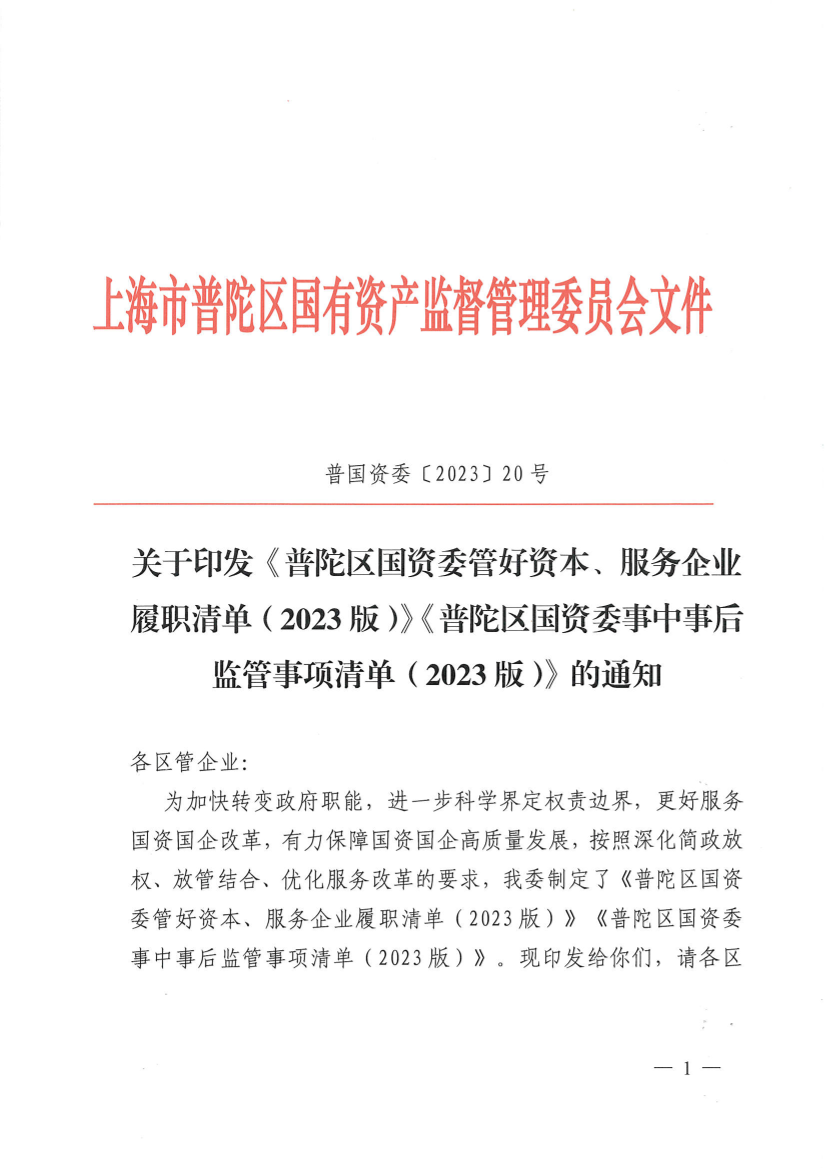 关于印发《普陀区国资委管好资本、服务企业履职清单(2023版)》《普陀区国资委事中事后监管事项清单(2023版)》的通知