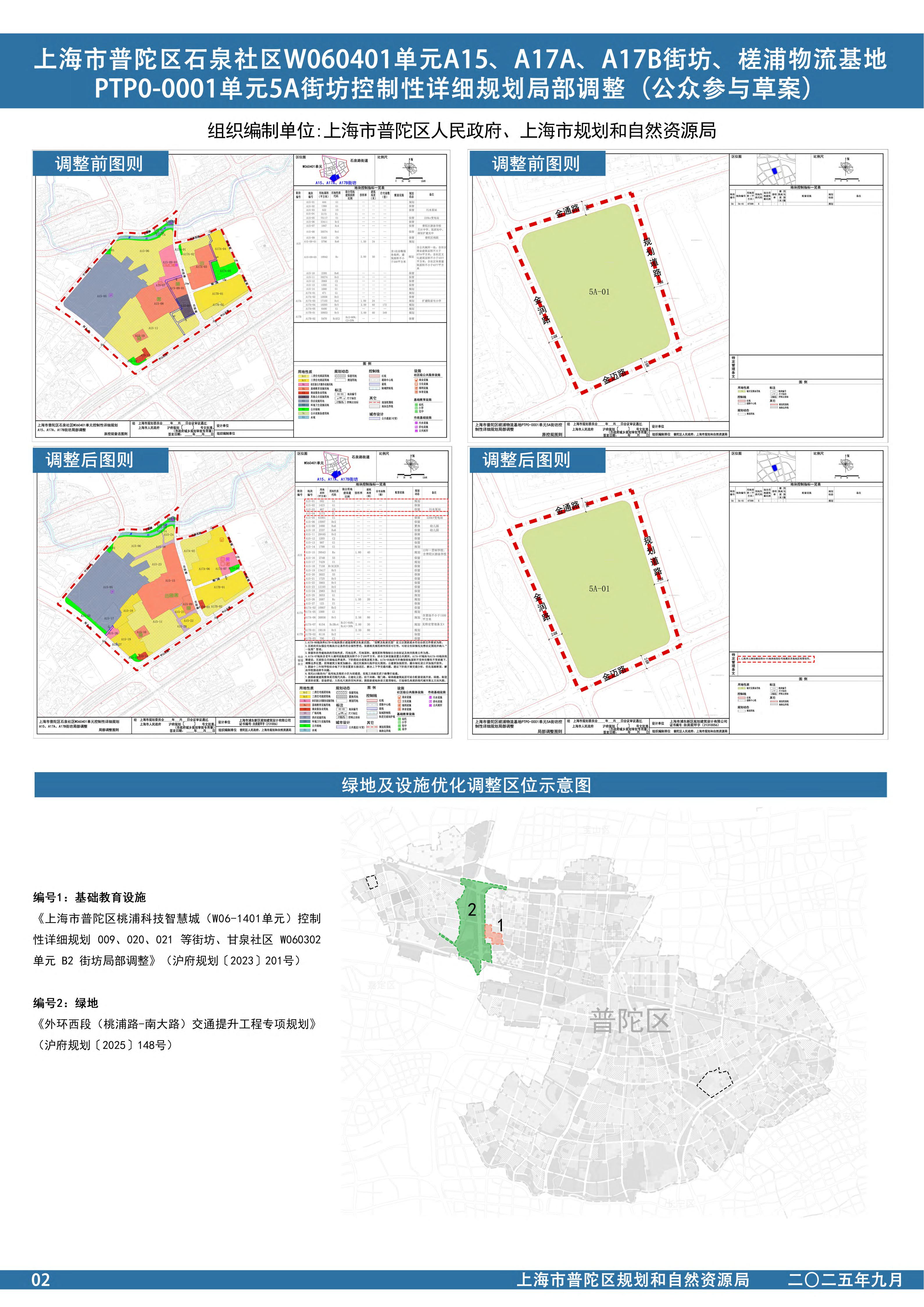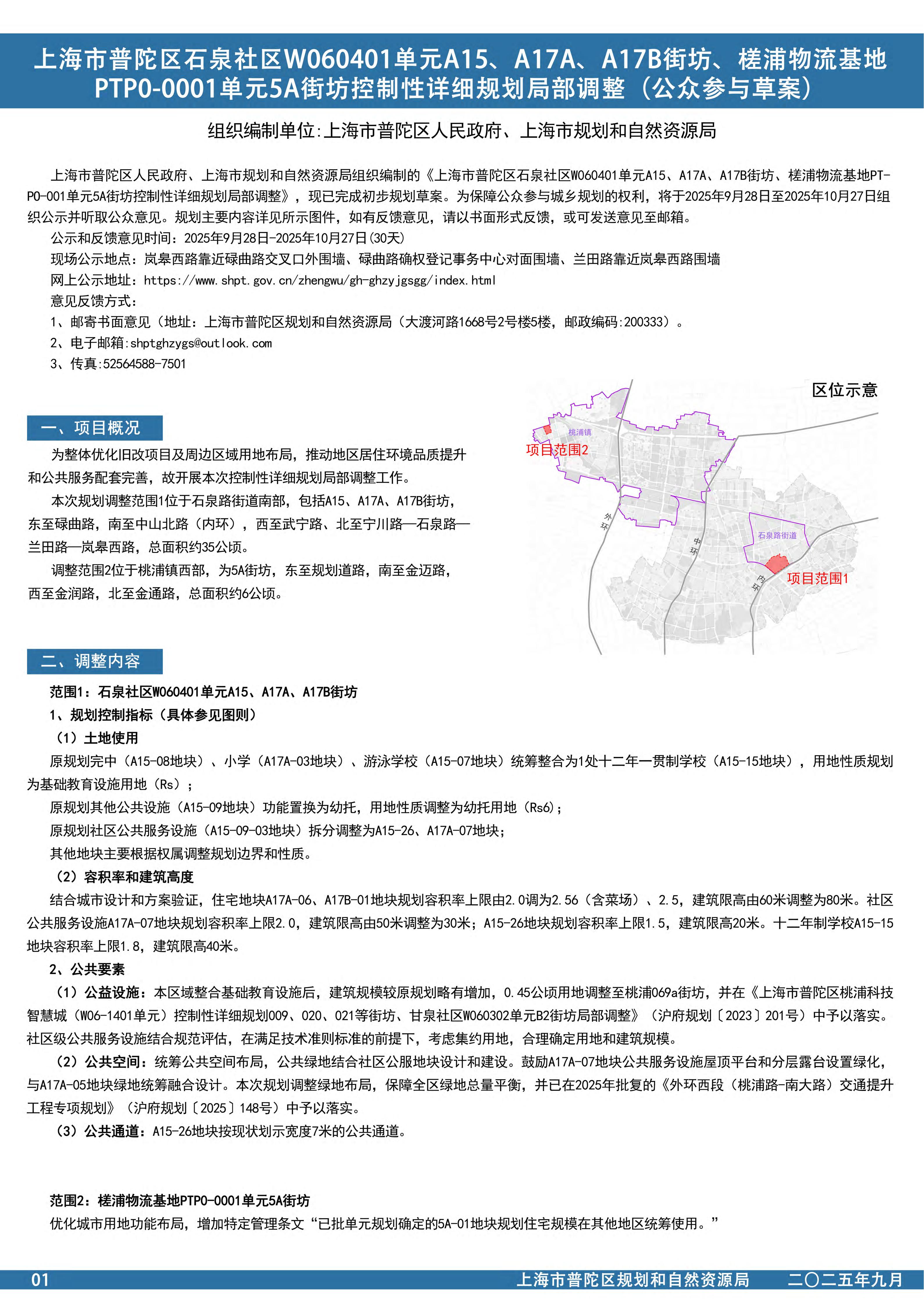 上海市普陀区石泉社区W060401单元A15、A17A、A17B街坊、槎浦物流基地PTP0-0001单元5A街坊控制性详细规划局部调整(公众参与草案)公示