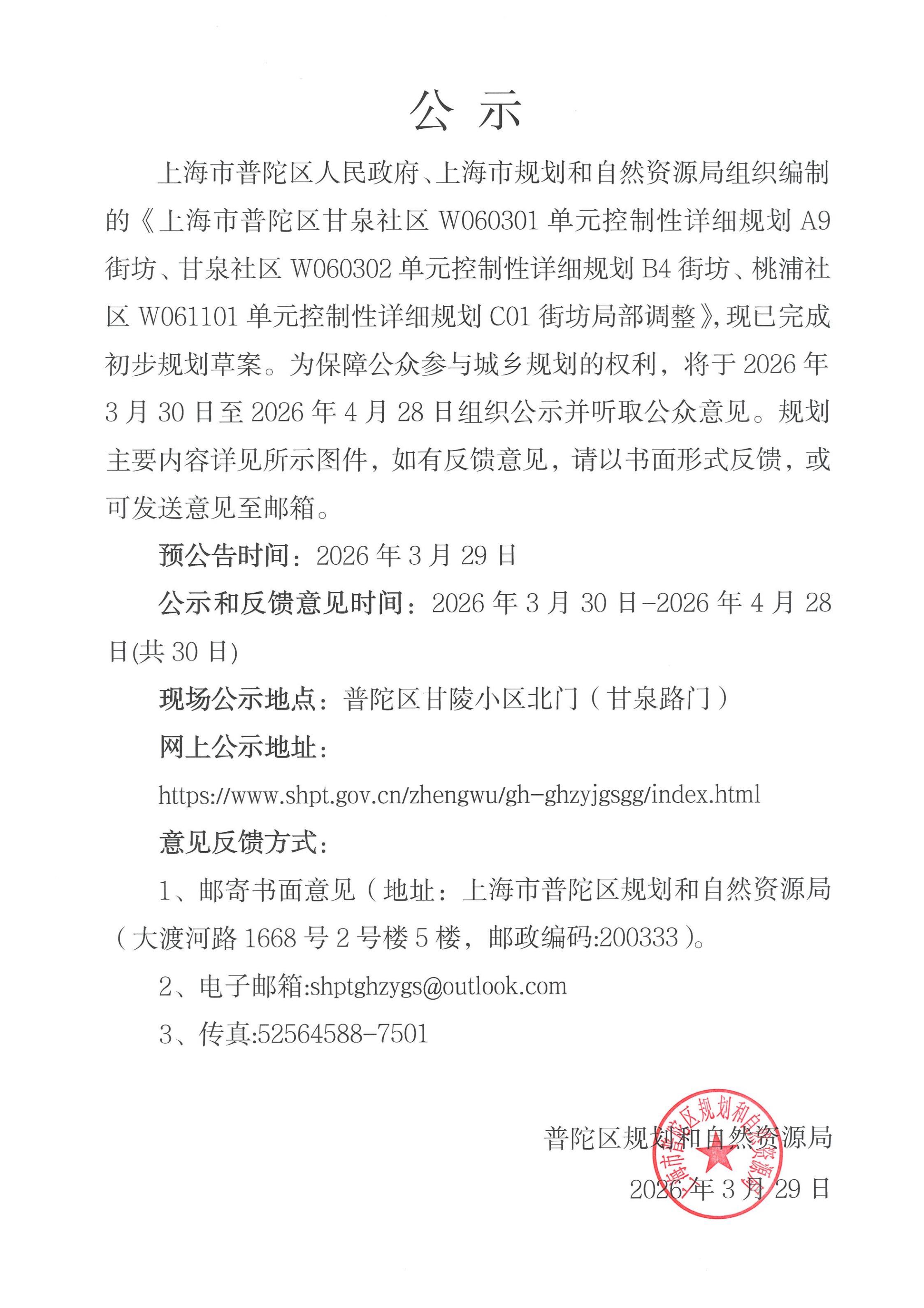 上海市普陀区甘泉社区W060301单元控制性详细规划A9街坊、甘泉社区W060302单元控制性详细规划B4街坊、桃浦社区W061101单元控制性详细规划C01街坊局部调整预公告