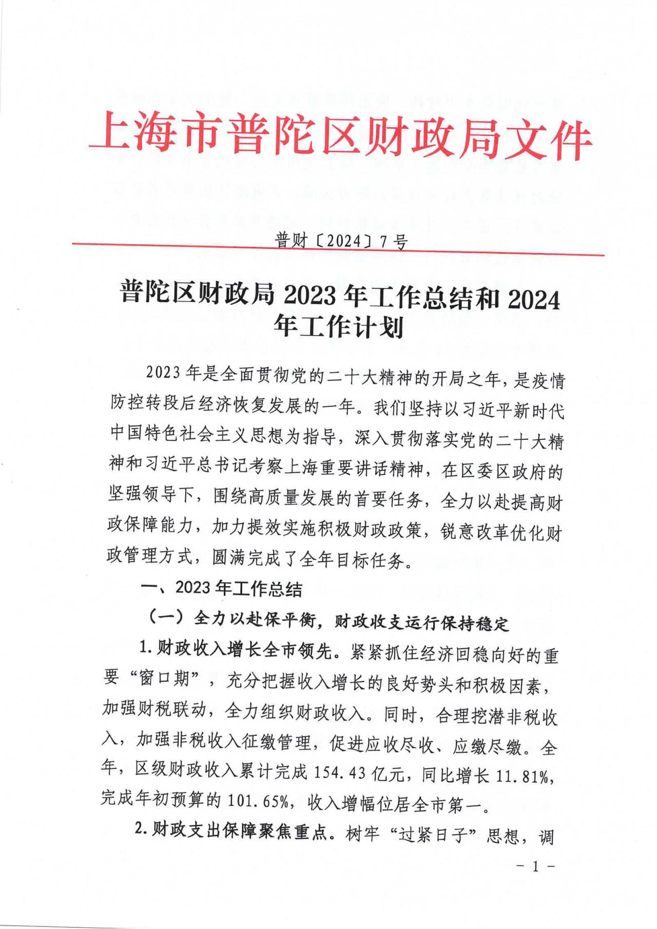 普陀区财政局2023年工作总结和2024年工作计划