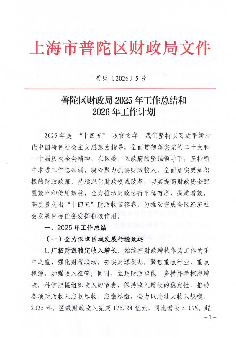 普陀区财政局2025年工作总结和2026年工作计划