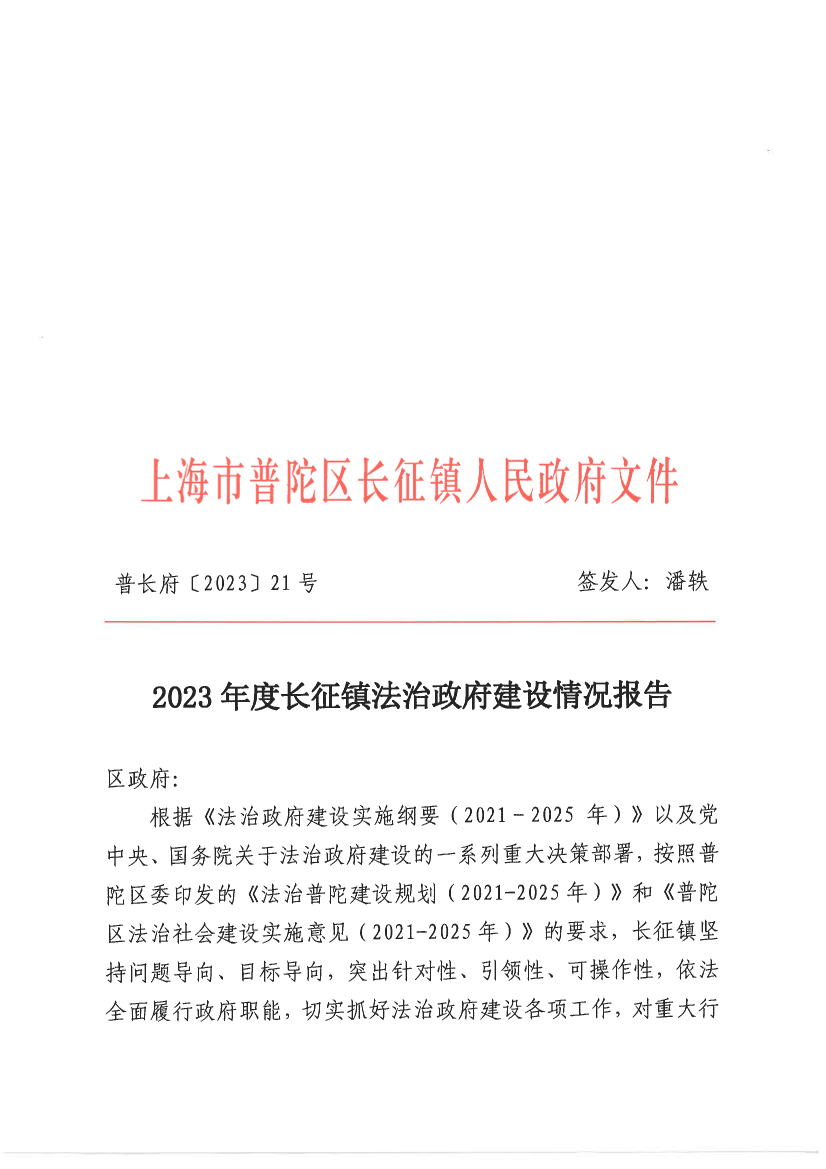 根据《法治政府建设实施纲要(2021-2025年)》以及党中央、国务院关于法治政府建设的一系列重大决策部署,按照普陀区委印发的《法治普陀建设规划(2021-2025年)》和《普陀区法治社会建设实施意见(2021-2025年)》的要求,长征镇坚持问题导向、目标导向,突出针对性、引领性、可操作性,依法全面履行政府职能,切实抓好法治政府建设各项工作,对重大行政决策以及政府督查工作加深理解、提高重视,不断强化法治政府建设工作。现将本镇2023年度法治政府建设工作的主要情况报告如下: