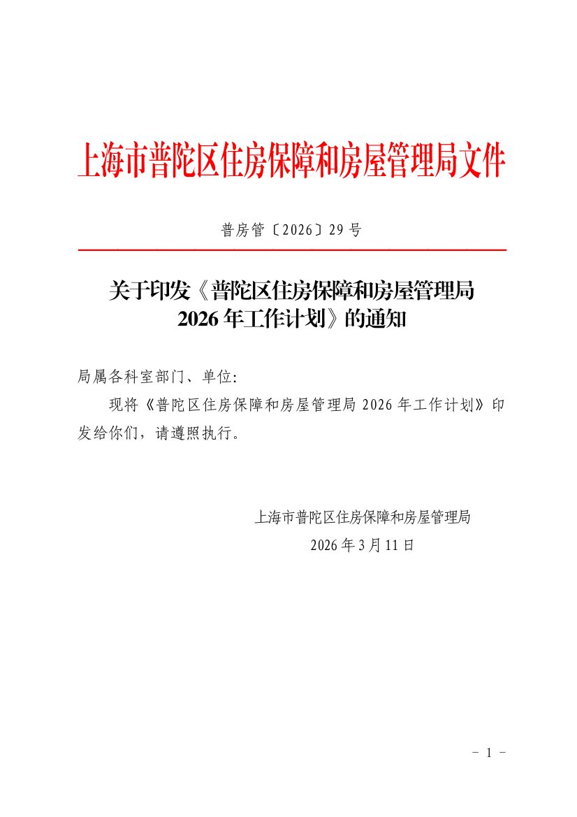 关于印发《普陀区住房保障和房屋管理局2026年工作计划》的通知