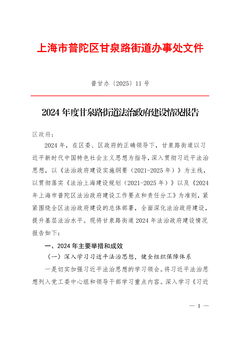 2024年度甘泉路街道法治政府建设情况报告