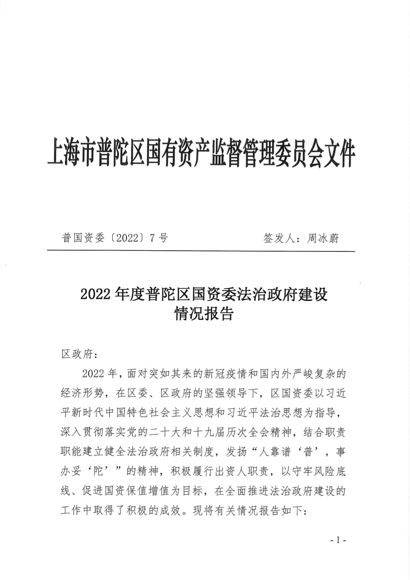 2022年,面对突如其来的新冠疫情和国内外严峻复杂的经济形势,在区委、区政府的坚强领导下,区国资委以习近平新时代中国特色社会主义思想和习近平法治思想为指导,深入贯彻落实党的二十大和十九届历次全会精神,结合职责职能建立健全法治政府相关制度,发扬“人靠谱‘普’,事办妥‘陀’”的精神,积极履行出资人职责,以守牢风险底线、促进国资保值增值为目标,在全面推进法治政府建设的工作中取得了积极的成效。现将有关情况报告如下: