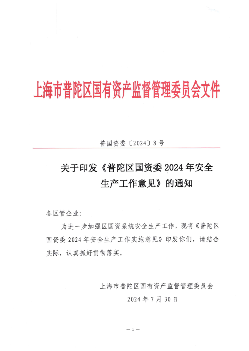 关于印发《普陀区国资委2024年安全 生产工作意见》的通知