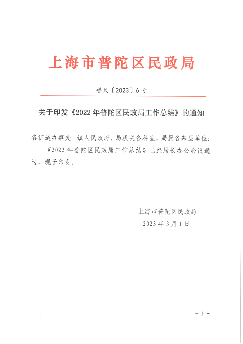 关于印发《2022年普陀区民政局工作总结》的通知