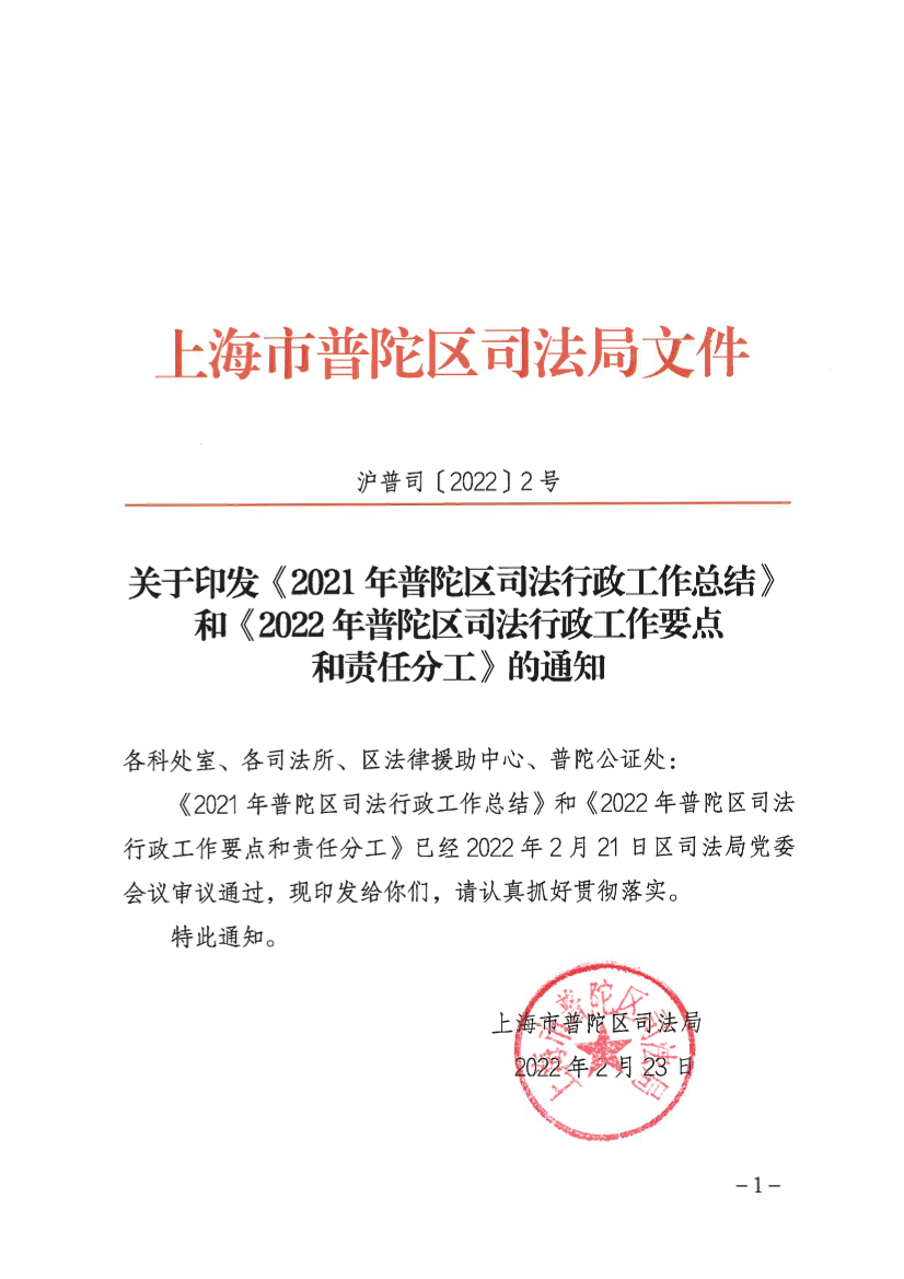 《2021年普陀区司法行政工作总结》和《2022年普陀区司法行政工作要点和责任分工》已经2022年2月21日区司法局党委会议审议通过,现印发给你们,请认真抓好贯彻落实。