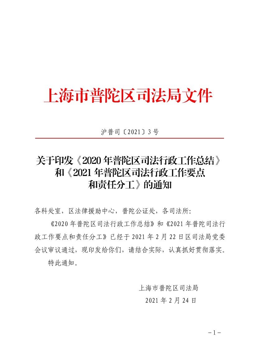 普陀区司法局关于印发《2020年普陀区司法行政工作总结》和《2021年普陀区司法行政工作要点和责任分工》的通知