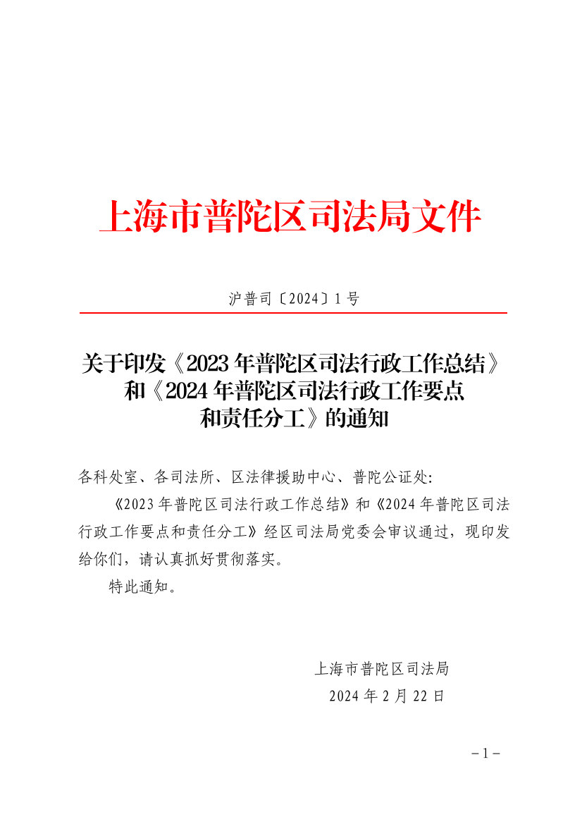 关于印发《2023年普陀区司法行政工作总结》和《2024年普陀区司法行政工作要点和责任分工》的通知