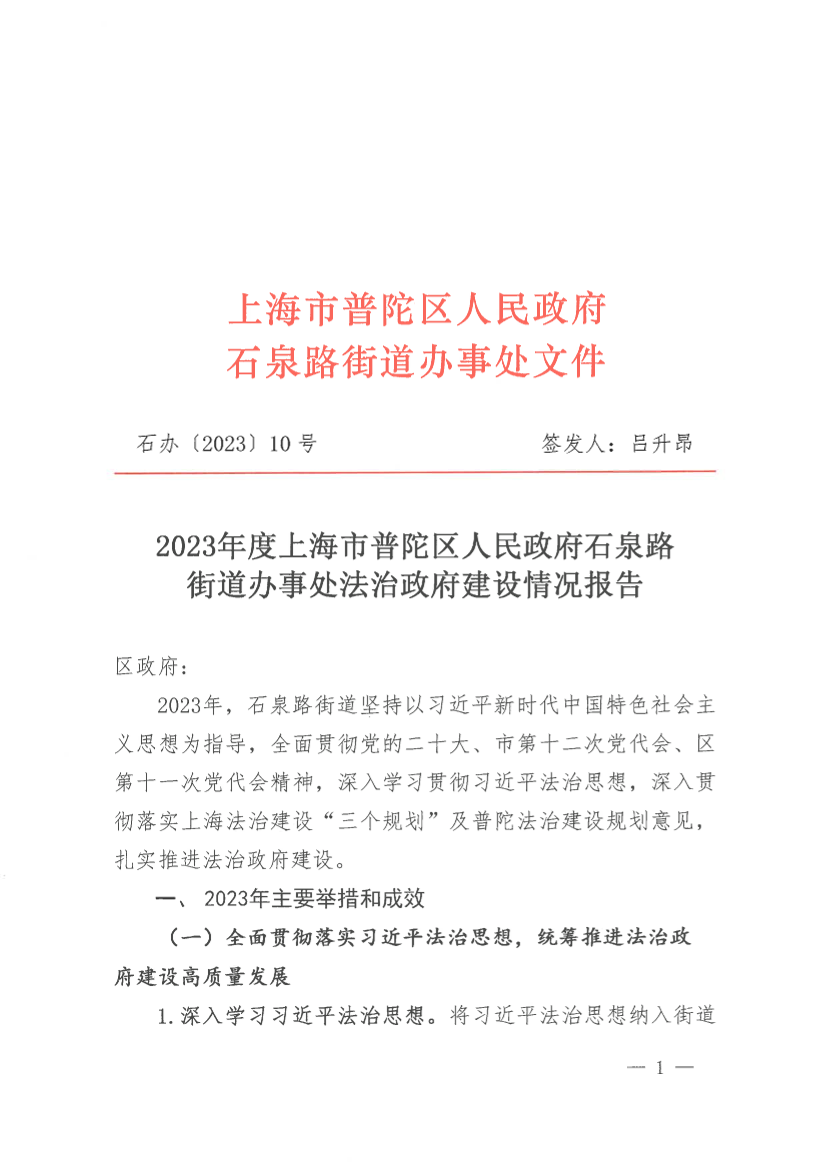 2023年度上海市普陀区人民政府石泉路街道办事处法治政府建设情况报告