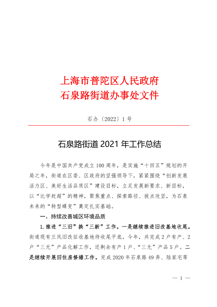 今年是中国共产党成立100周年,是实施“十四五”规划的开局之年,街道在区委、区政府的坚强领导下,紧紧围绕“创新发展活力区、美好生活品质区”建设目标,立足发展新要求、新目标,以“比学赶超”的精神,聚焦重点、探索路径、拔点攻坚,为石泉未来的“转型蝶变”奠定扎实基础。
