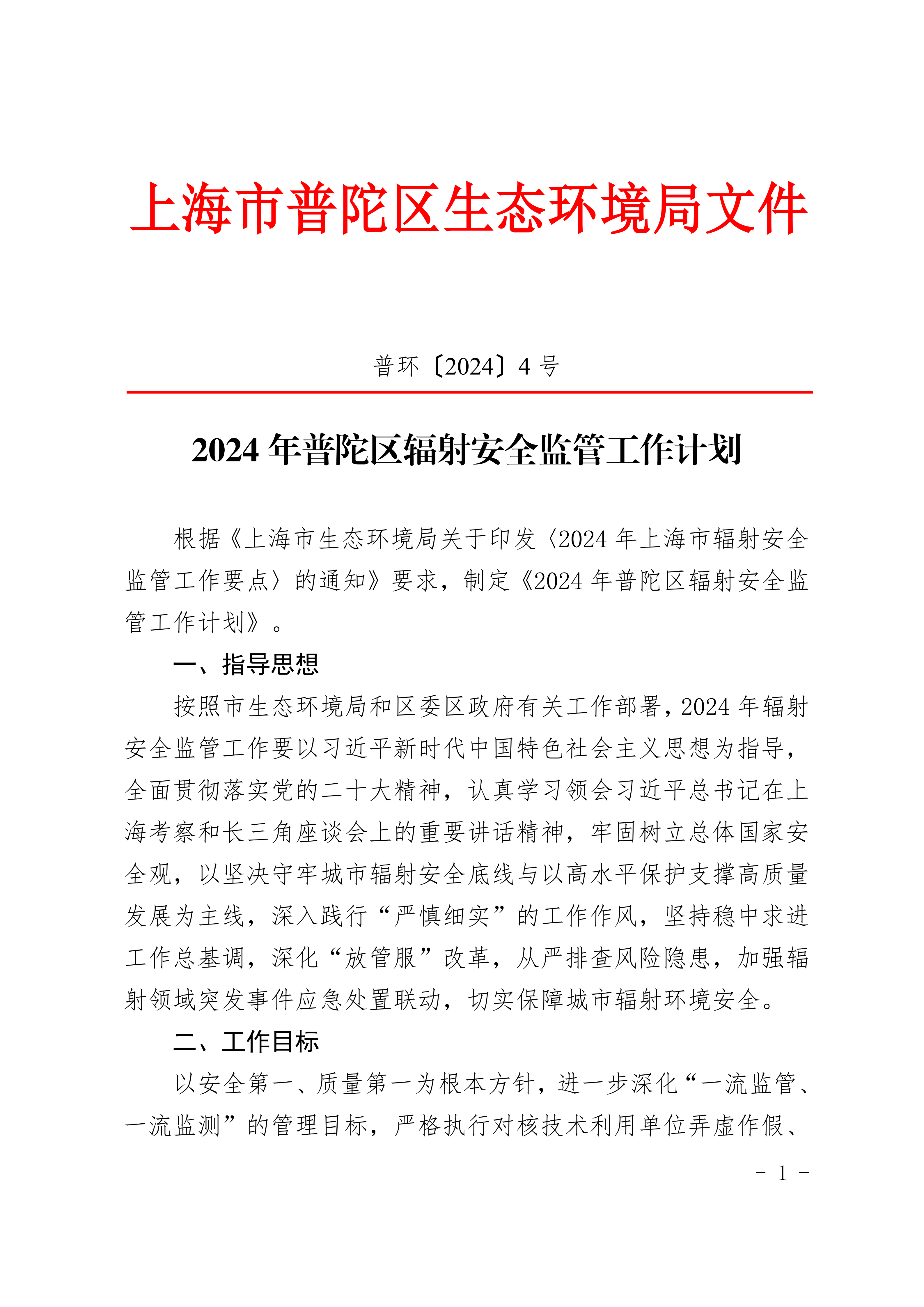 根据《上海市生态环境局关于印发〈2024年上海市辐射安全监管工作要点〉的通知》要求,制定《2024年普陀区辐射安全监管工作计划》。