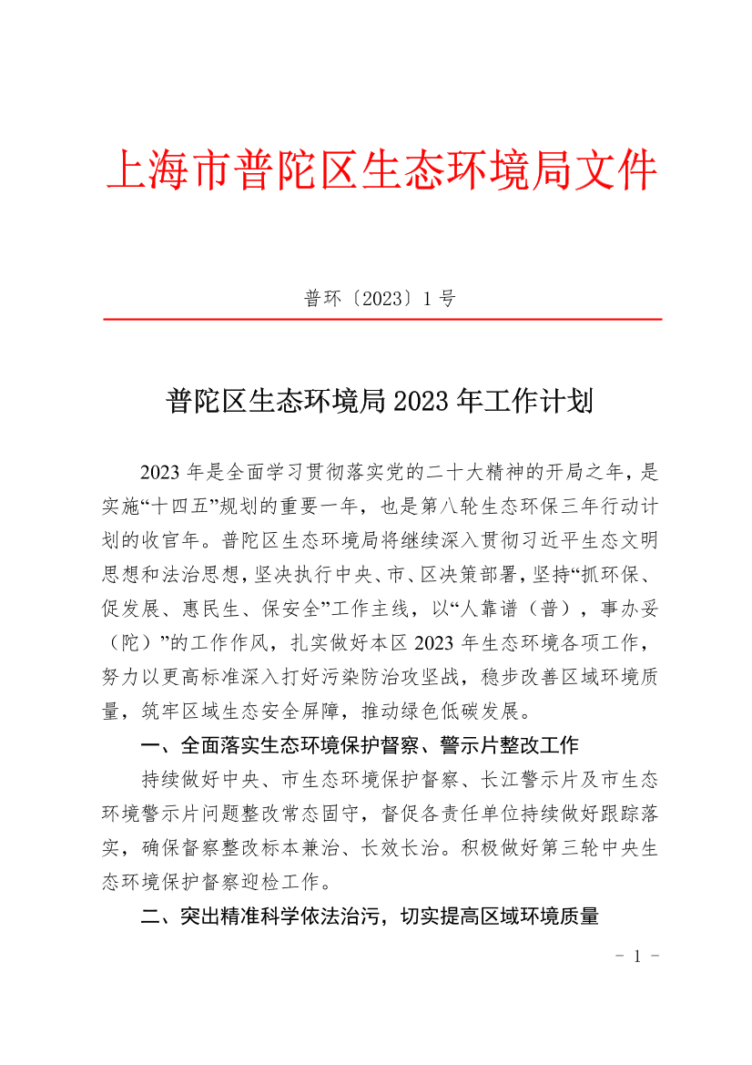 2023年是全面学习贯彻落实党的二十大精神的开局之年,是实施“十四五”规划的重要一年,也是第八轮生态环保三年行动计划的收官年。普陀区生态环境局将继续深入贯彻习近平生态文明思想和法治思想,坚决执行中央、市、区决策部署,坚持“抓环保、促发展、惠民生、保安全”工作主线,以“人靠谱(普),事办妥(陀)”的工作作风,扎实做好本区2023年生态环境各项工作,努力以更高标准深入打好污染防治攻坚战,稳步改善区域环境质量,筑牢区域生态安全屏障,推动绿色低碳发展。