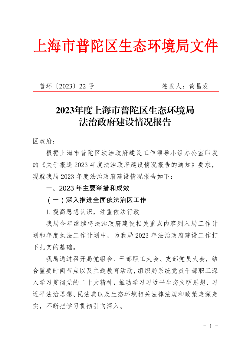 2023年度上海市普陀区生态环境局法治政府建设情况报告
