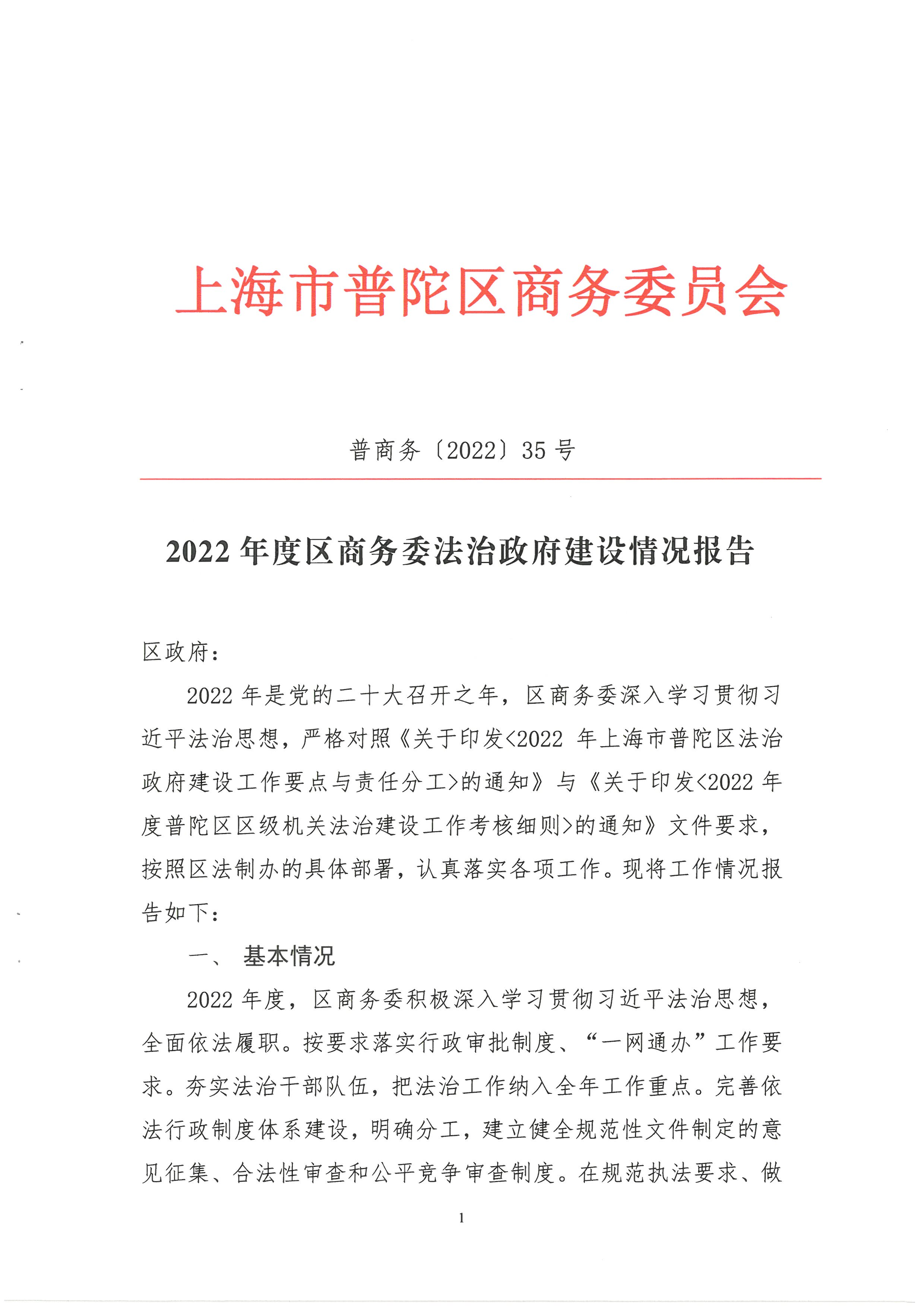2022年是党的二十大召开之年,区商务委深入学习贯彻习近平法治思想,严格对照《关于印发<2022 年上海市普陀区法治政府建设工作要点与责任分工>的通知》与《关于印发<2022年度普陀区区级机关法治建设工作考核细则>的通知》文件要求,按照区法制办的具体部署,认真落实各项工作。现将工作情况报告如下: