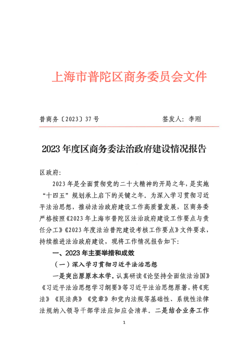 2023年是全面贯彻党的二十大精神的开局之年,是实施“十四五”规划承上启下的关键之年。为深入学习贯彻习近平法治思想,推动法治政府建设工作高质量发展,区商务委严格按照《2023年上海市普陀区法治政府建设工作要点与责任分工》《2023年度法治普陀建设考核工作要点》文件要求,持续推进法治政府建设,现将工作情况报告如下: