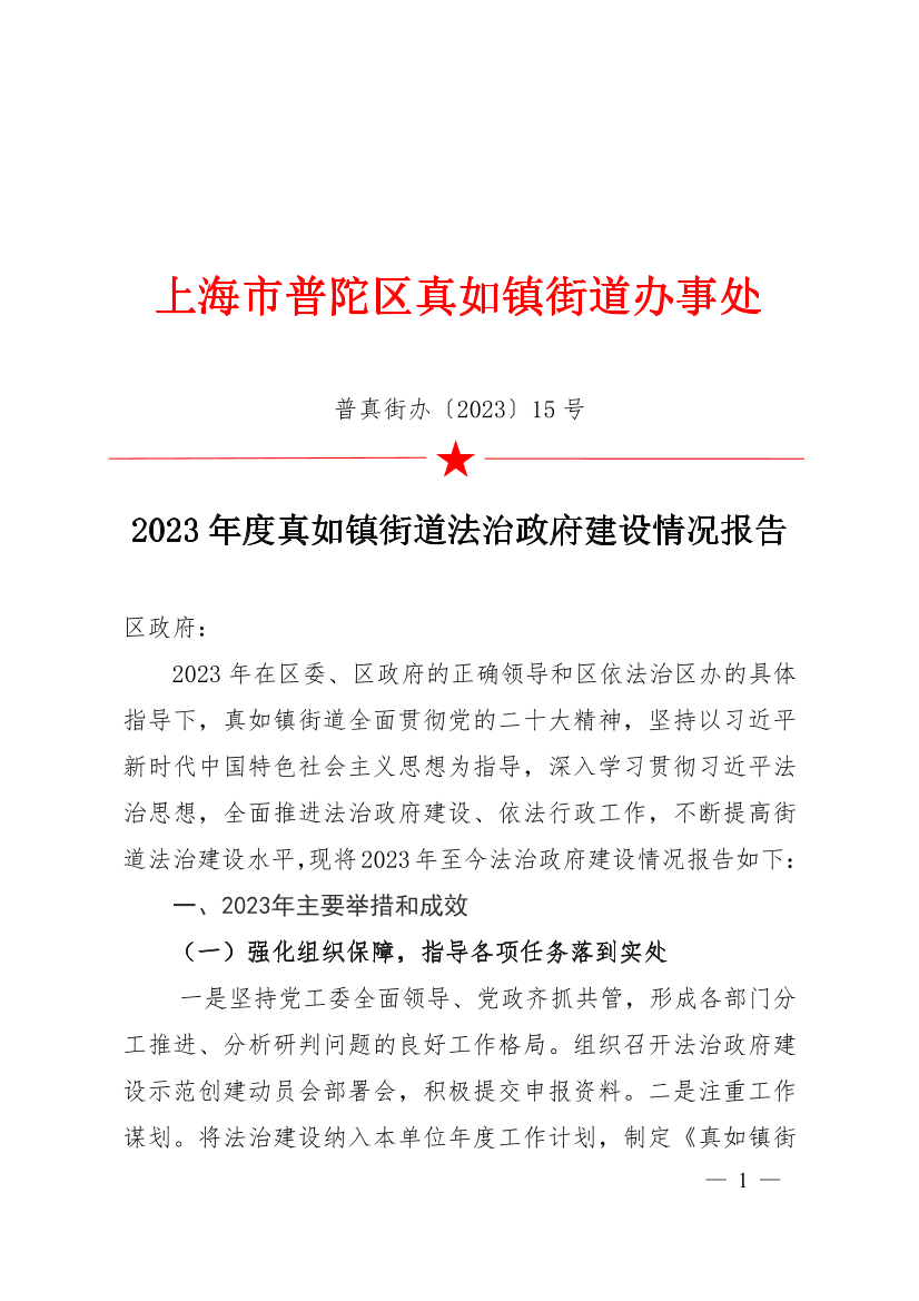 2023年在区委、区政府的正确领导和区依法治区办的具体指导下,真如镇街道全面贯彻党的二十大精神,坚持以习近平新时代中国特色社会主义思想为指导,深入学习贯彻习近平法治思想,全面推进法治政府建设、依法行政工作,不断提高街道法治建设水平,现将2023年至今法治政府建设情况报告如下: