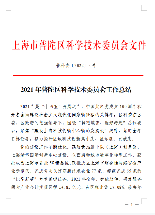 党的建设工作不断优化。高质量推进中以(上海)创新园、上海清华国际创新中心建设。全面启动城市数字化转型工作,获批成为上海市首批5G精品区。获批成立上海市综合性网络安全产业示范区。完成首次认定高新技术企业77家,超额完成65家的“比学赶超”力争目标任务。2021年全年,智能软件、研发服务两大产业合计实现区税14.85亿元,占区税比重17.08%,较去年同期提高4.24个百分点,超额完成占比合计提升两个百分点目标任务;招商引进新企业281家,完成区税9454.3万元,完成比例147.72%。