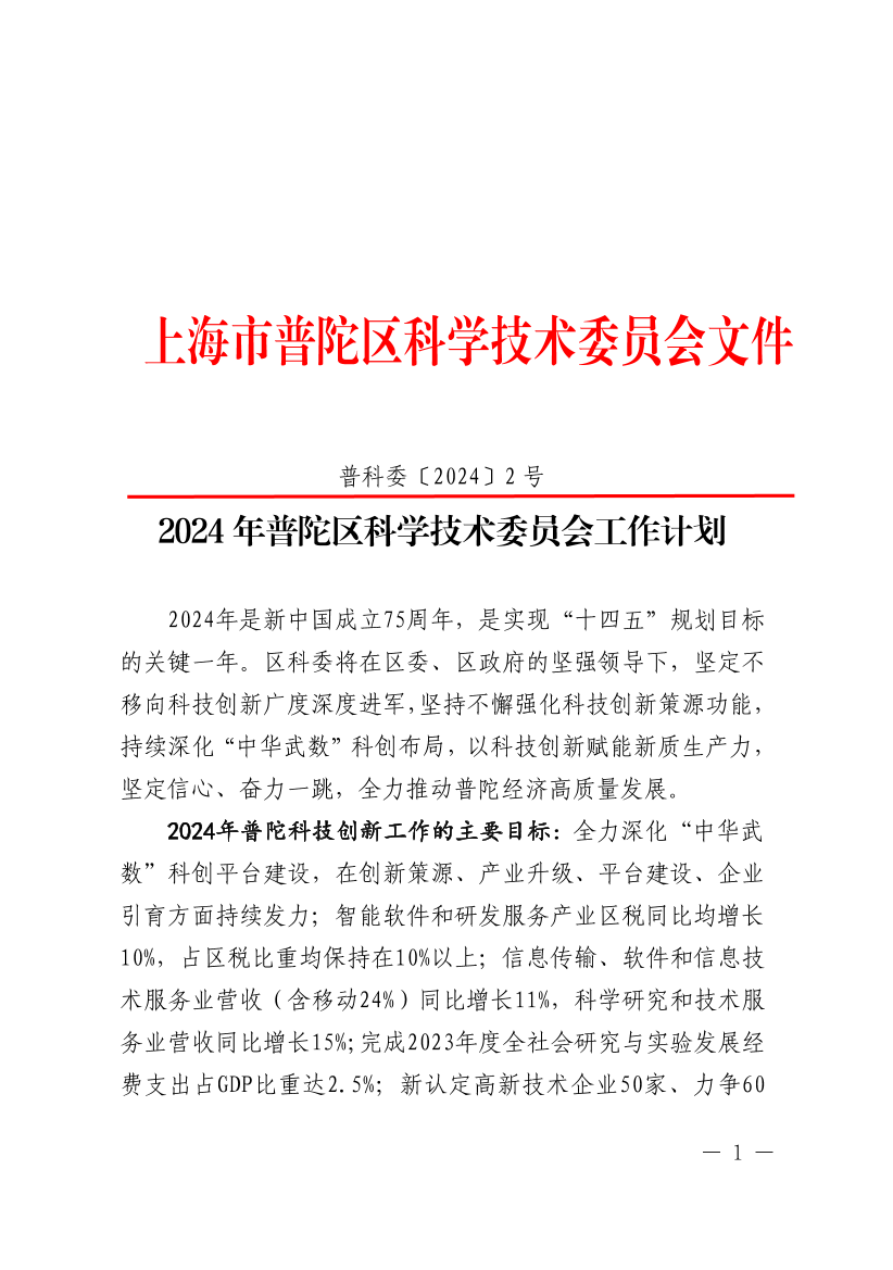 2024年普陀科技创新工作的主要目标:全力深化“中华武数”科创平台建设,在创新策源、产业升级、平台建设、企业引育方面持续发力;智能软件和研发服务产业区税同比均增长10%,占区税比重均保持在10%以上;信息传输、软件和信息技术服务业营收(含移动24%)同比增长11%,科学研究和技术服务业营收同比增长15%;完成2023年度全社会研究与实验发展经费支出占GDP比重达2.5%;新认定高新技术企业50家、力争60家,培育市、区科技小巨人企业20家,支持区“互联网+”企业10家;实现技术合同成交额超110亿元;招商引资企业2024年合计产区税突破1亿元;新增数字化转型示范项目和标杆场景20个,新开通5G室外宏站200个;完成50个住宅小区地下车库移动通信网络覆盖。
