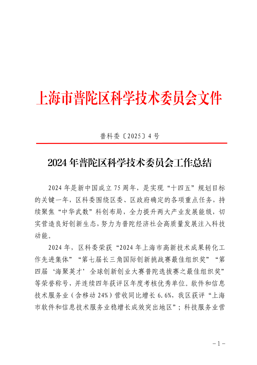 2024年是新中国成立75周年,是实现“十四五”规划目标的关键一年,区科委围绕区委、区政府确定的各项重点任务,持续聚焦“中华武数”科创布局,全力提升两大产业发展能级,切实营造良好创新生态,努力为普陀经济社会高质量发展注入科技动能。