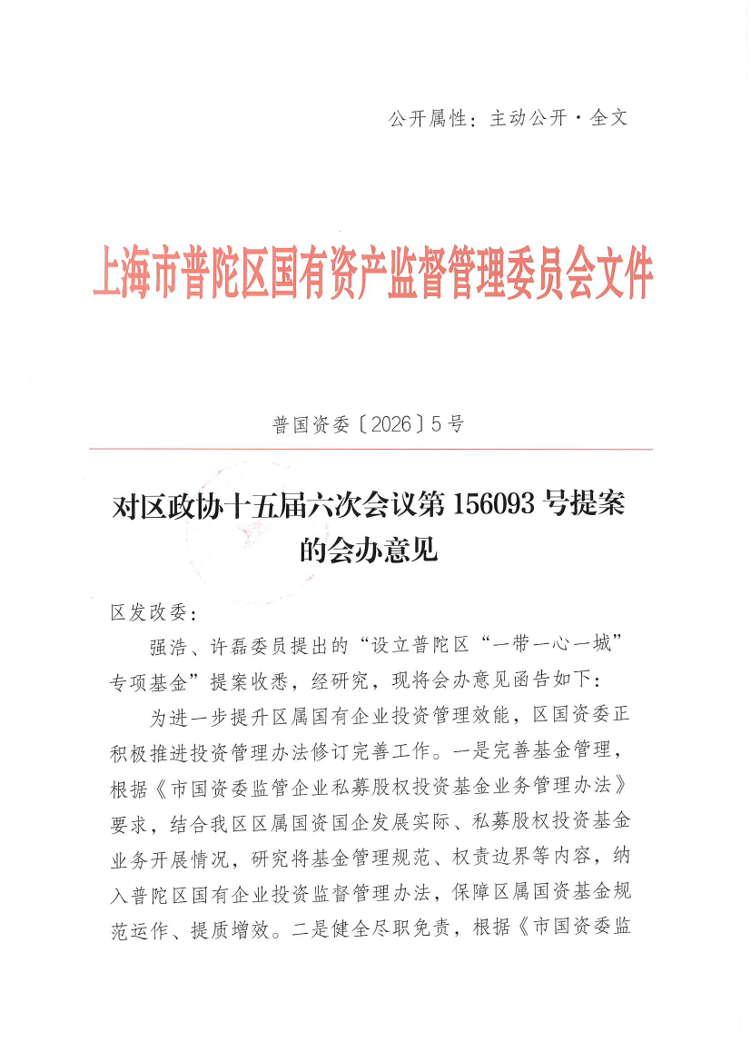 强浩、许磊委员提出的“设立普陀区“一带一心一城”专项基金”提案收悉,经研究,现将会办意见函告如下: