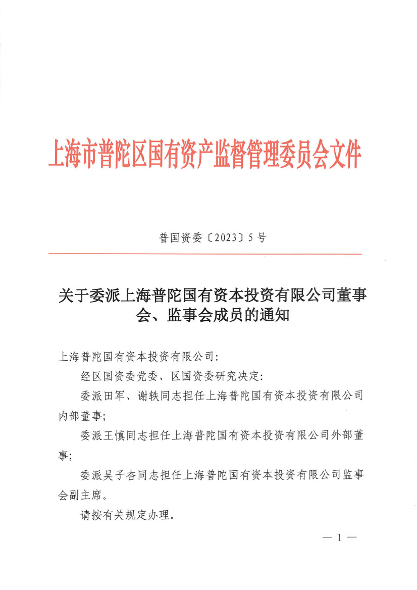 关于委派上海普陀国有资本投资有限公司董事会、监事会成员的通知