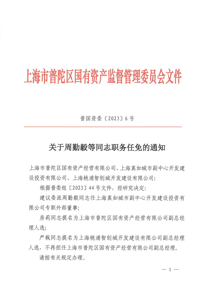 严戟同志提名为上海桃浦智创城开发建设有限公司副总经理人选,不再担任上海市普陀区国有资产经营有限公司副总经理。