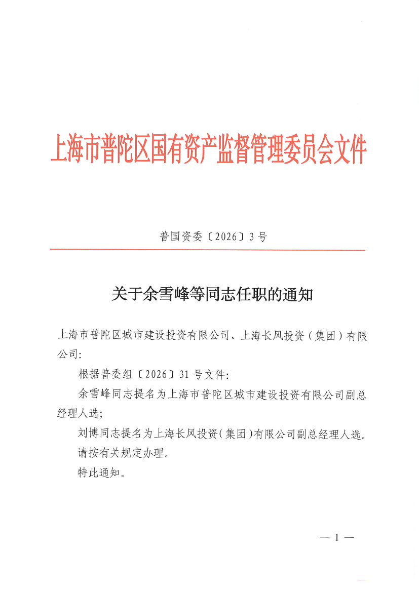 余雪峰同志提名为上海市普陀区城市建设投资有限公司副总经理人选;