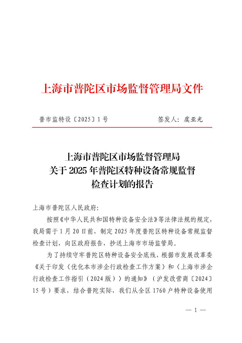 上海市普陀区市场监督管理局关于2025年普陀区特种设备常规监督检查计划的报告