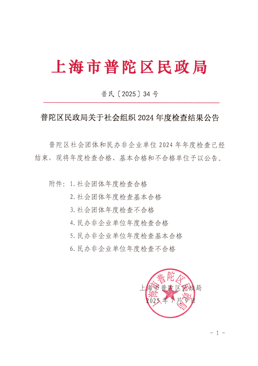 普陀区民政局关于社会组织2024年度检查结果公告
