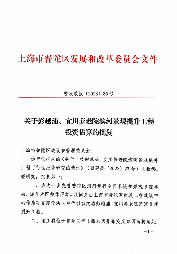 你单位报来的《关于上报彭越浦、宜川养老院滨河景观提升工程可行性报告研究的请示》(普建委〔2023〕23号)文收悉。经研究,批复如下: