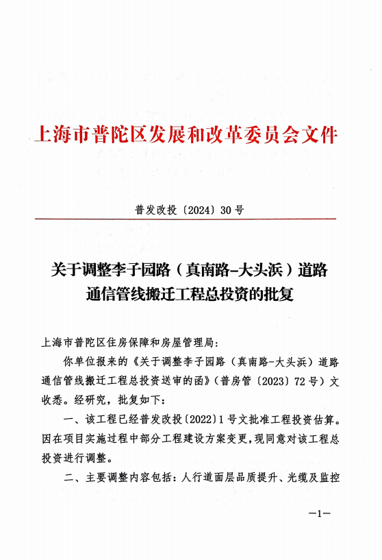 你单位报来的《关于调整李子园路(真南路-大头浜)道路通信管线搬迁工程总投资送审的函》(普房管〔2023〕72号)文收悉。经研究,批复如下: