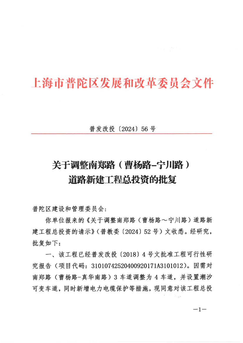 你单位报来的《关于调整南郑路(曹杨路~宁川路)道路新建工程总投资的请示》(普教委〔2024〕52号)文收悉。经研究,批复如下: