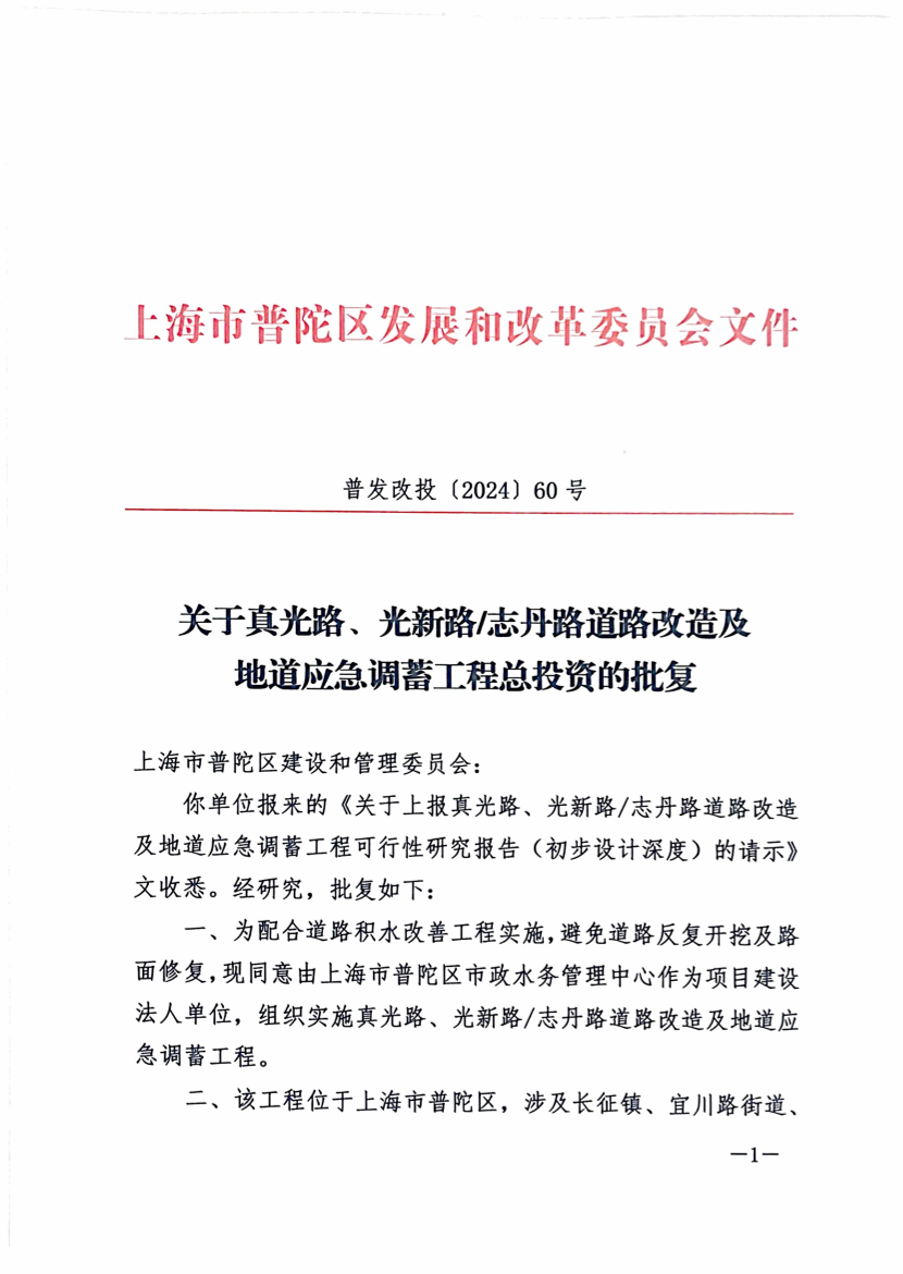 一、为配合道路积水改善工程实施,避免道路反复开挖及路面修复,现同意由上海市普陀区市政水务管理中心作为项目建设法人单位,组织实施真光路、光新路/志丹路道路改造及地道应急调蓄工程。