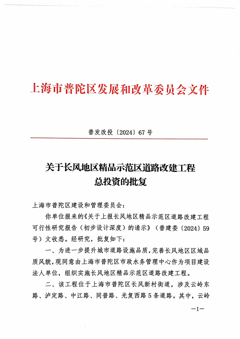 一、为进一步提升城市道路设施品质,完善长风地区区域品质风貌,现同意由上海市普陀区市政水务管理中心作为项目建设法人单位,组织实施长风地区精品示范区道路改建工程。