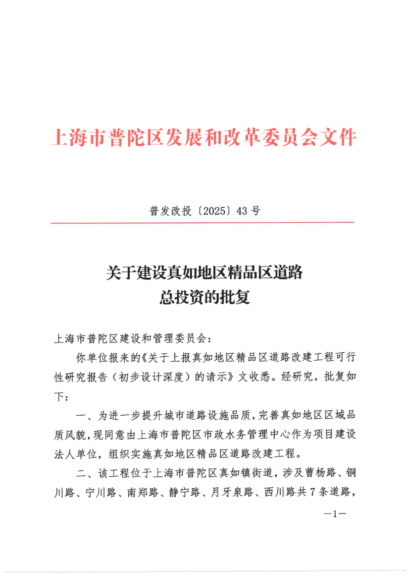一、为进一步提升城市道路设施品质,完善真如地区区域品质风貌,现同意由上海市普陀区市政水务管理中心作为项目建设法人单位,组织实施真如地区精品区道路改建工程。