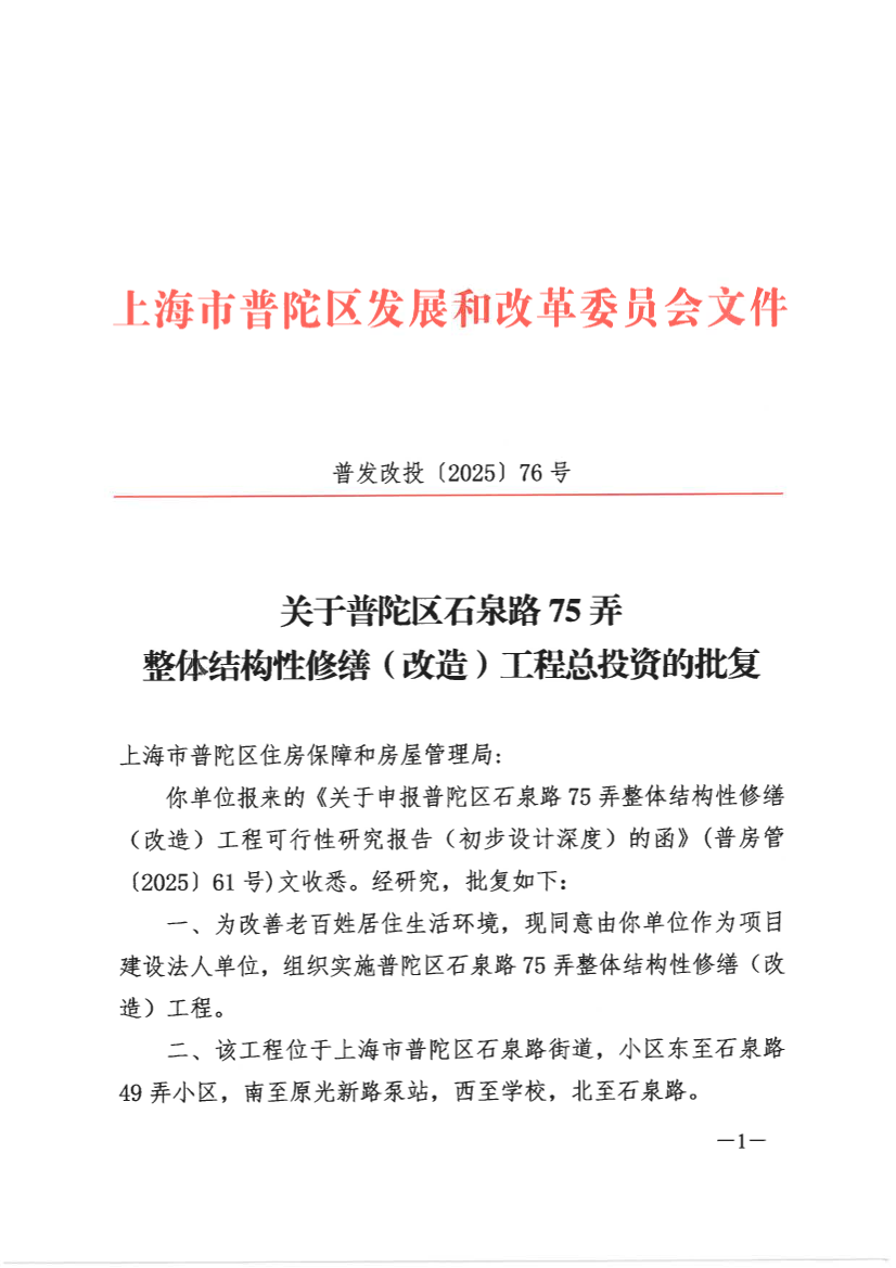 你单位报来的《关于申报普陀区石泉路75弄整体结构性修缮(改造)工程可行性研究报告(初步设计深度)的函》(普房管〔2025〕61号)文收悉。经研究,批复如下: