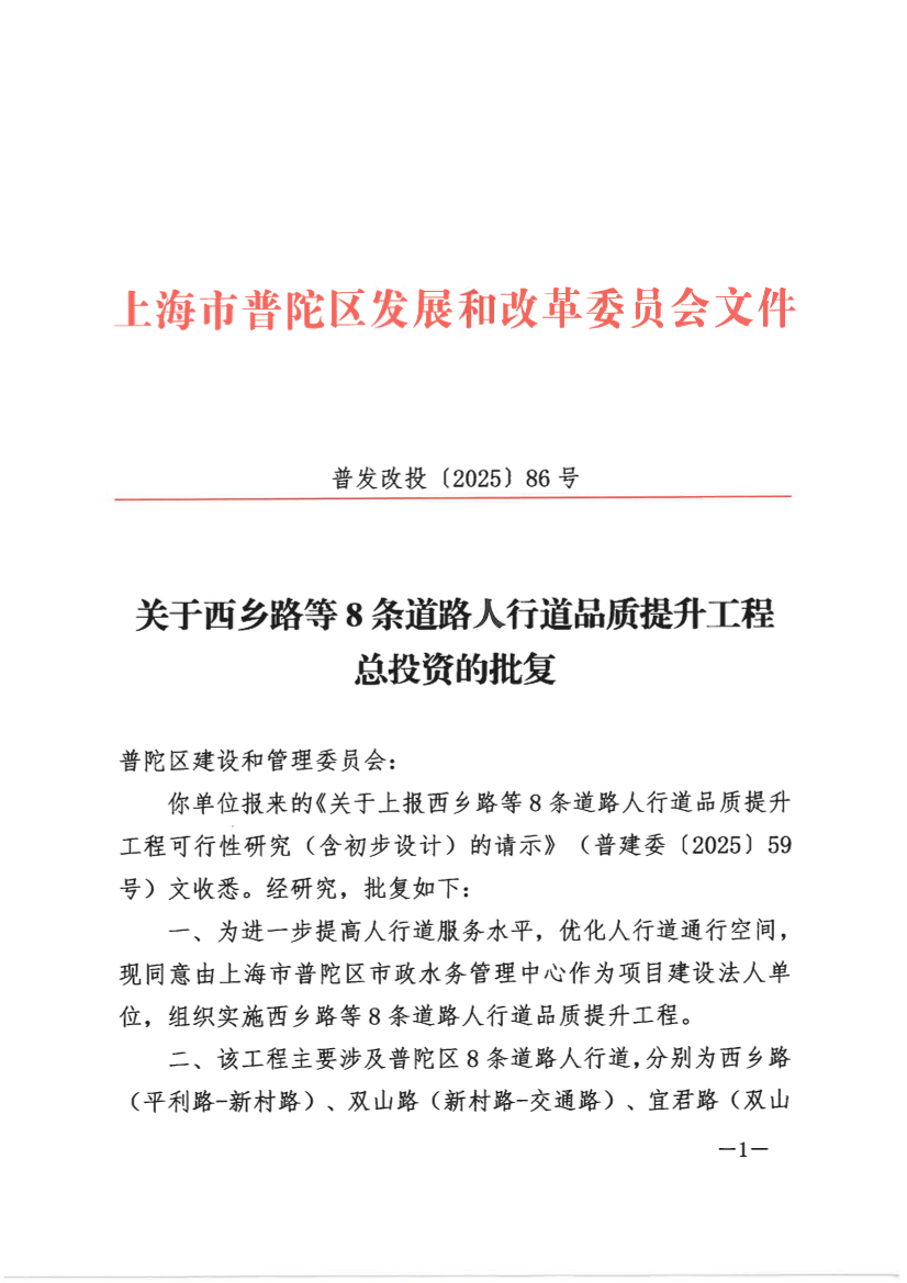 你单位报来的《关于上报西乡路等8条道路人行道品质提升工程可行性研究(含初步设计)的请示》(普建委〔2025〕59号)文收悉。经研究,批复如下: